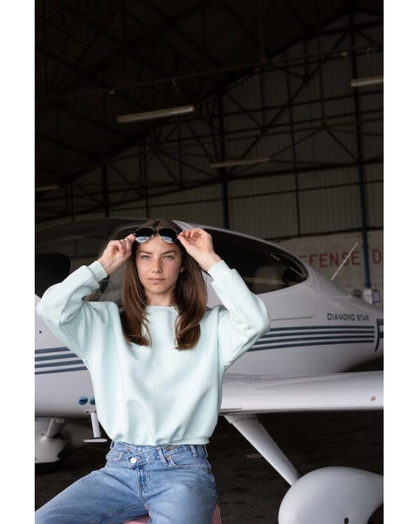 Coupe oversize légèrement crop, avec emmanchure basse pour un look rétro-contemporain. Matière doux doux en coton. Manches 7/8, molletonné à l'intérieur pour plus de douceur et de chaleur. La couleur Skylight offre douceur et lumière. Disponible en matchy-matchy avec le sweat enfant.