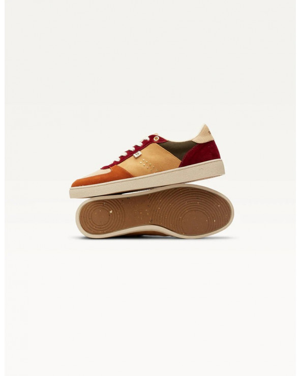 Notre basket basse Marie en couleurs cognac, crème et bordeaux est un choix éco-responsable du vestiaire féminin. Dessinée par Charlotte dans notre QG parisien, elle est fabriquée au Portugal avec des matières sourcées en Espagne et au Portugal. Elle ose le mélange de matières avec des empiècements en suède vegan, velours et cuir. Doublée en mesh, elle est équipée d'une semelle (re)colte, la première semelle fabriquée à partir de chaussures et de caoutchouc recyclés. Ses lacets en coton organique et sa construction Strobel assurent confort et souplesse.