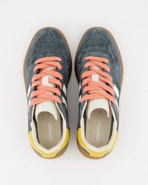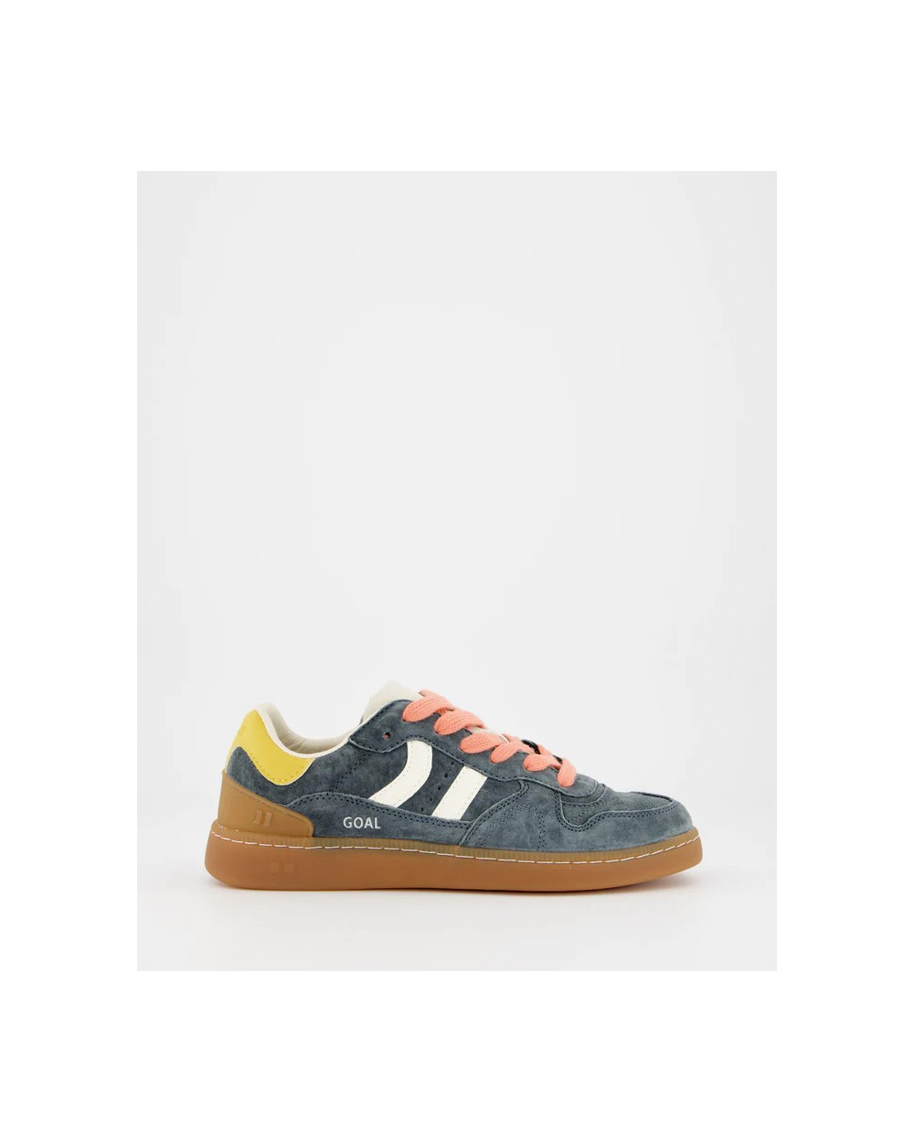 Chaussure de sport en daim avec détails de couleurs contrastées. Languette en cuir et préformée avec rembourrage figuré. Vues de la doublure en cuir. Lacets plats interchangeables en coton bicolore. Col légèrement rembourré. La partie avant est dotée d'un renfort de couture. Semelle flexible en caoutchouc/caoutchouc qui offre durabilité et adhérence. Il porte le nom du modèle « GOAL » sur le côté en vieil or.
