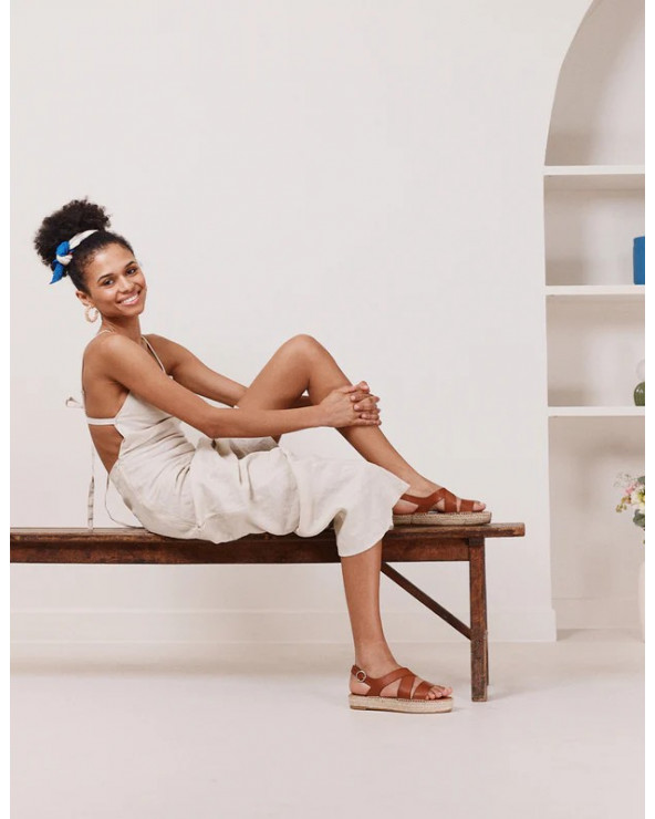 Here comes the sun. Avec son cousu espadrille et sa semelle plateau de 3 centimètres en corde – doublée d’une semelle d’usure en gomme – on le sait : cette sandale en cuir cognac vous rappelle vos meilleurs souvenirs de vacances. Brides larges et fermeture à boucle pour le style… tout y est. Attention toutefois : si Chantal est idéale au soleil, elle supporte mal les jours de pluie.