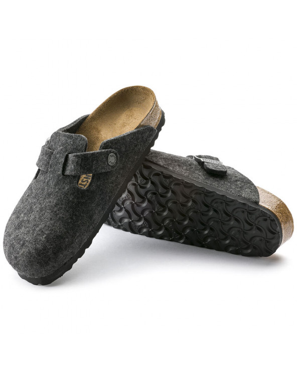 Le sabot Boston, un classique parmi les modèles de BIRKENSTOCK, se présente ici avec un tige en feutre de laine doux et de grande qualité. À l'aide de la bride intégrée à la bordure supérieure de la tige et d'une solide boucle en métal, le sabot s'adapte à chaque pied de manière individuelle.