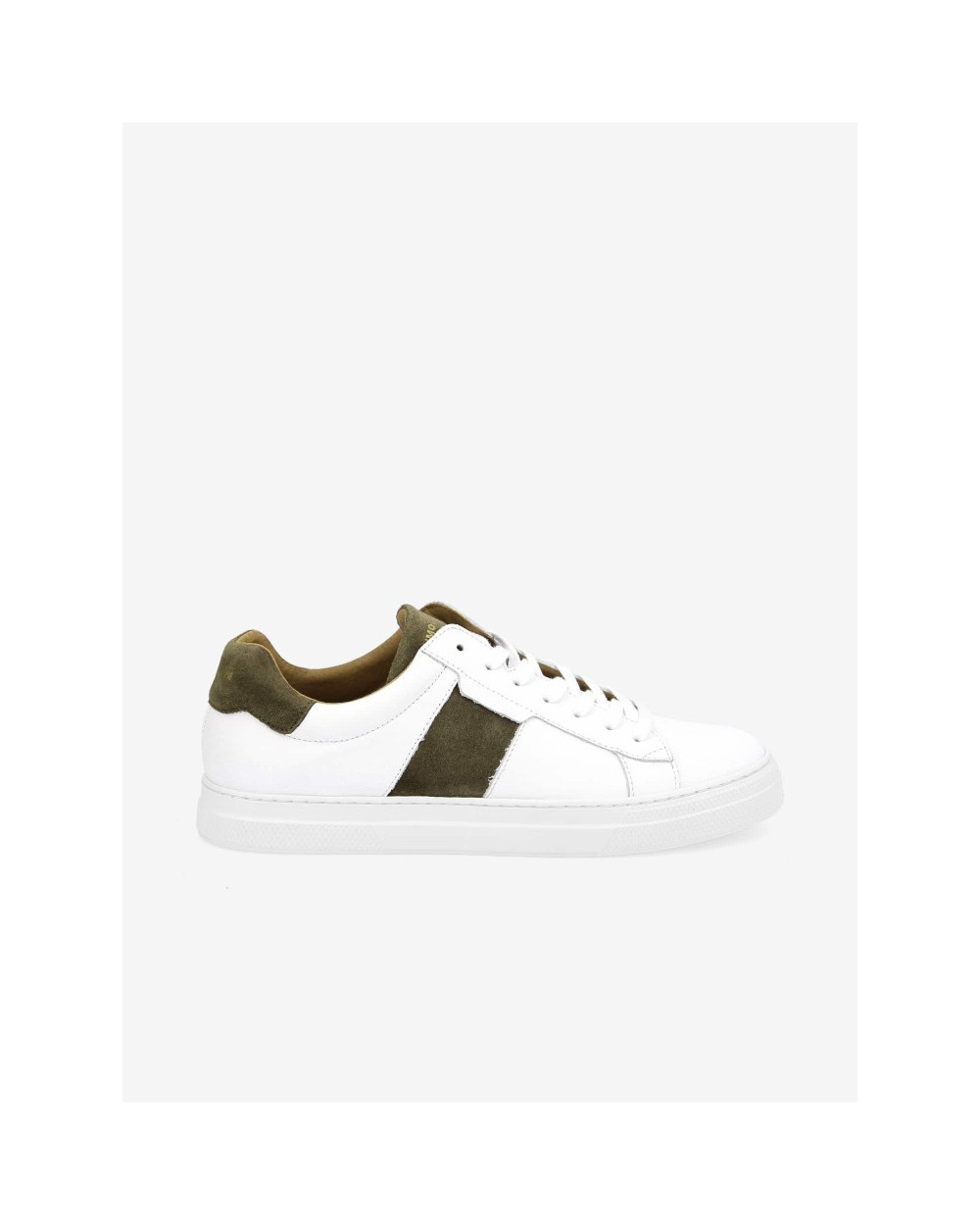 - Languette en cuir lisse blanc avec empiècement en cuir velours vert forêt et patch blanc avec logo Schmoove doré imprimé
