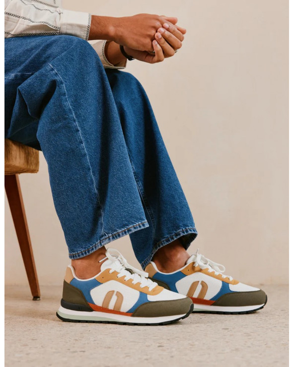Découvrez Adrien en kaki blanc moutarde, notre nouvelle basket pour homme. Dessinée dans notre QG parisien, elle est éco-designée pour un minimum d'impact carbone. Notre modèle Adrien est fabriqué à partir de suède vegan et mesh. Confectionnnée avec une semelle extérieure en EVA et un patin en gomme recyclée, elle garantit confort et légèreté. Le cousu Strobel, une technique de montage de cordonnerie traditionelle, apporte souplesse et confort.