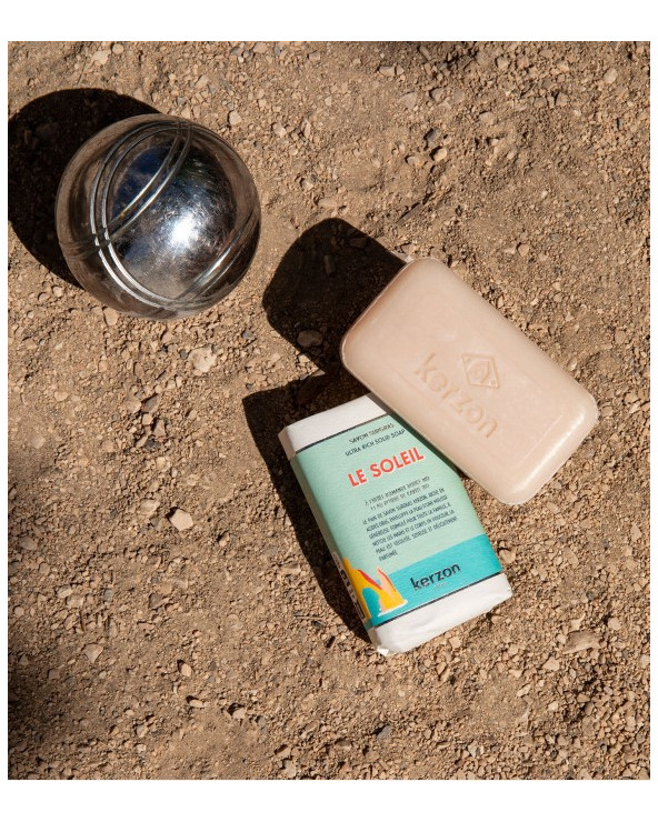 Le savon solide surgras Kerzon, riche en acides gras naturels, en beurre de karité et en huile d'amande douce bio, enveloppe la peau d’une mousse onctueuse et la parfume délicatement.