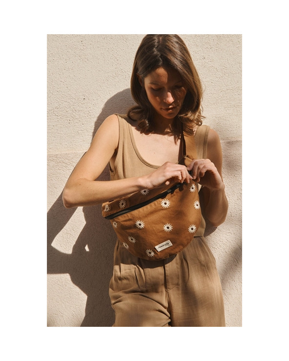 Fabriqué en coton recyclé camel avec des tournesols beiges, il est parfait pour un usage quotidien. Sa doublure beige, en tissu récupéré, et son zip noir vieux laithon ajoutent une touche moderne et intemporel.